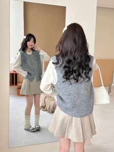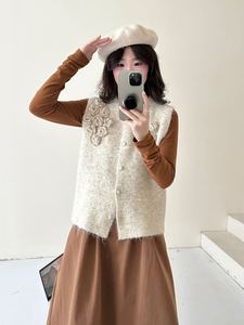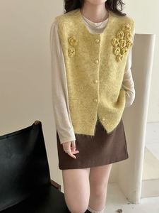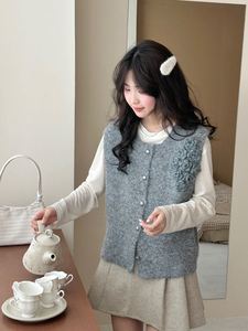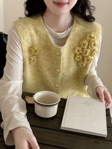 毛茸茸软糯立体花朵针织马甲背心女早秋季新款宽松单排扣毛衣坎肩