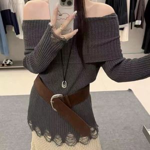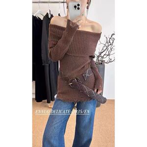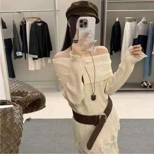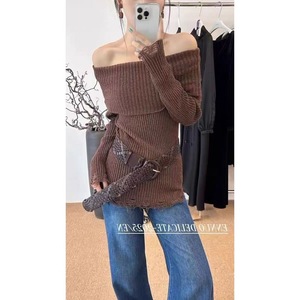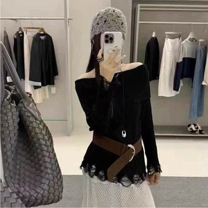 韩系一字领露肩长袖针织衫女秋毛边破洞坑条收腰显瘦上衣黑色均码