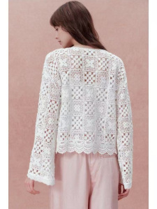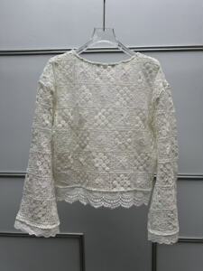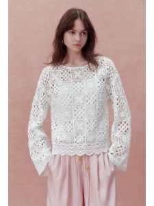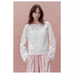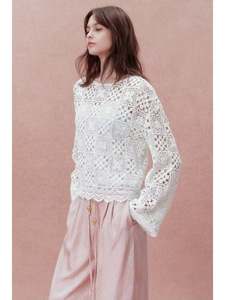 南油高版本批发法式四叶草祖母方格钩花镂空刺绣圆领两件套衬衫女