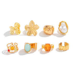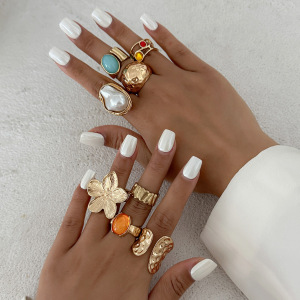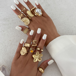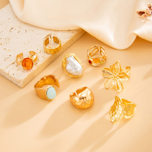 欧美跨境夸张ins彩钻巴洛克关节戒指套装 法式花朵敲打纹指环手饰
