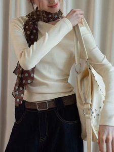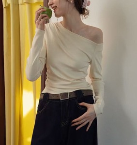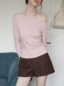 EGKA 斜肩针织长袖T恤女秋新款纯色修身气质显瘦露肩收腰温柔上衣