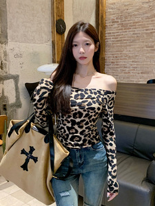 美式辣妹豹纹一字肩长袖T恤女2025秋冬新款外贸掐腰纯欲女装上衣