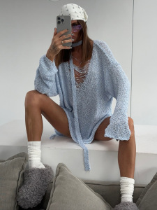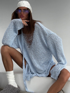 欧美时髦跨境女装流苏针织上衣宽松U领飘带长袖套头衫慵懒休闲风