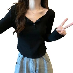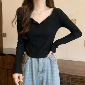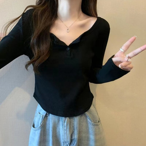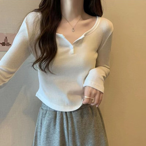 2025设计感弧形长袖正肩T恤女秋款半开领修身洋气外穿长袖上衣潮