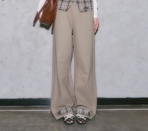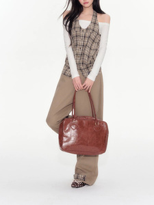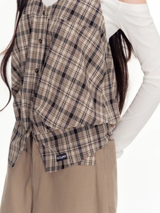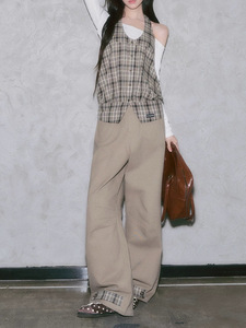 i 复古格子无袖挂脖吊带上衣一字肩刺绣修身打底衫马甲+裤子套装