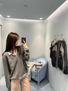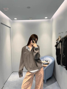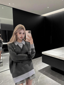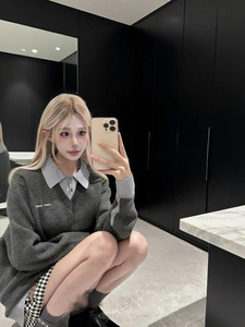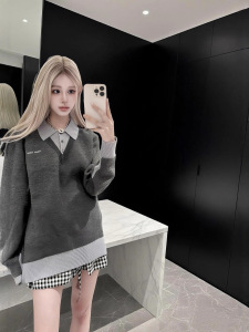 跨境正确某书网红款MM家25ss秋冬新款翻领假两件针织套头时尚百搭