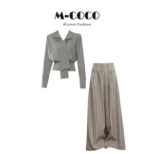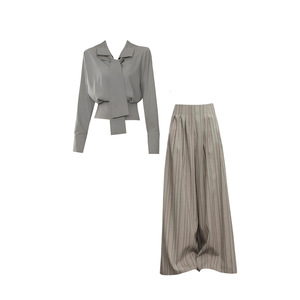 秋季新款慵懒感条纹长袖衬衫上衣女宽松显瘦休闲长裤套装
