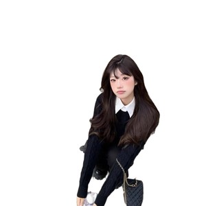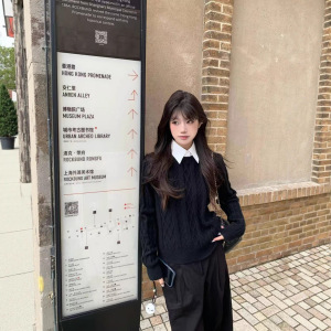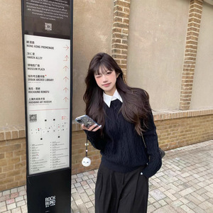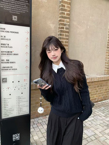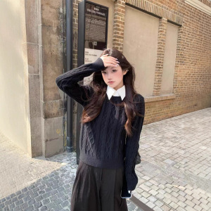 2025美式复古学院风假两件绞花黑色毛衣女秋冬季感正肩针织衫上衣