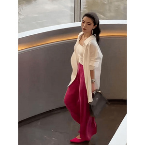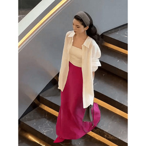 御姐范知性风长袖衬衫内搭吊带上衣玫红色半身裙三件套
