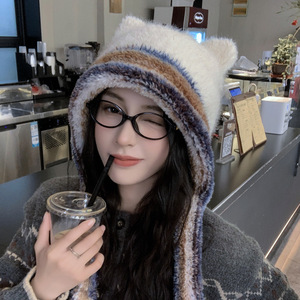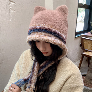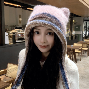 25冬季新款韩版帽子女可爱小熊耳朵毛绒流苏毛线帽保暖护耳显脸小