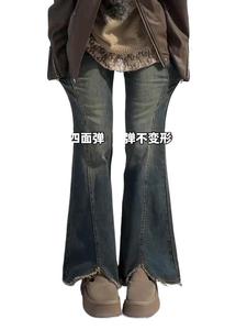 复古蓝毛边微喇牛仔裤女秋季新款大码胖mm高腰显瘦遮胯弹力喇叭裤