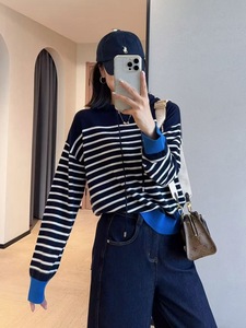 高品质羊毛混纺条纹连帽衫宽松显瘦撞色长袖针织衫2025秋3322L
