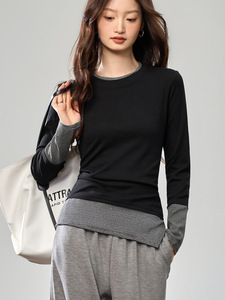 #40支精梳纯棉#设计感拼接条纹假两件长袖t恤女打底衫秋外穿上衣