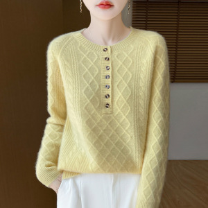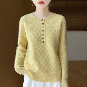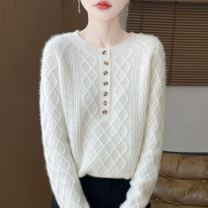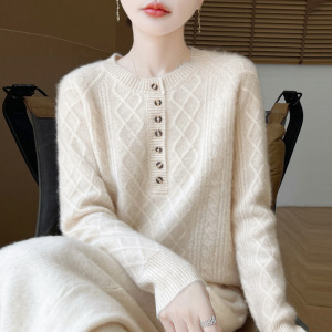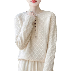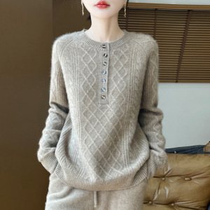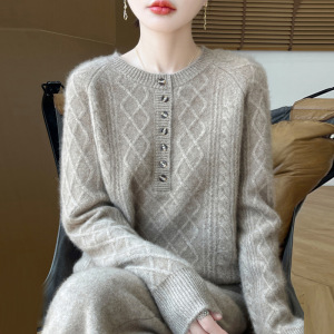 100%纯羊毛2025秋冬新款女式宽松圆领菱形提花套头打底针织衫毛衣