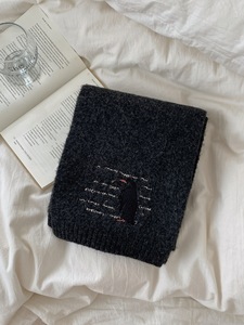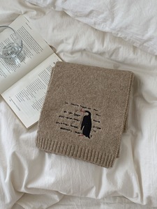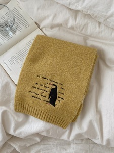 韩版羊毛混纺围巾女冬季2025新款企鹅刺绣百搭纯色围脖学生高级感