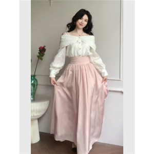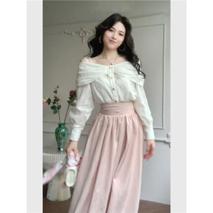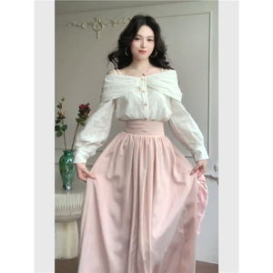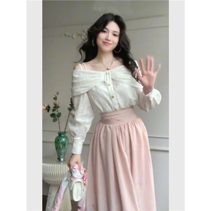 深圳南油韩系早秋穿搭一整套小洋装气质白色一字肩上衣半身裙套装