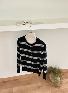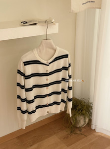 25秋冬季女装外套韩系圆领休闲条纹贝母扣时尚羊毛衫针织毛衣开衫