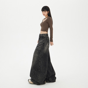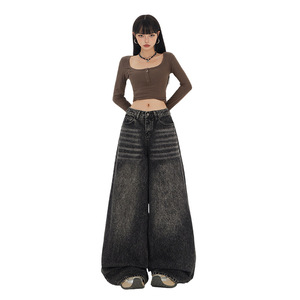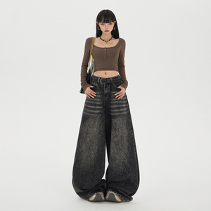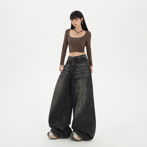 【今茵】高街美式复古高腰宽松牛仔阔腿裤慵懒风百搭拖地裤女新款