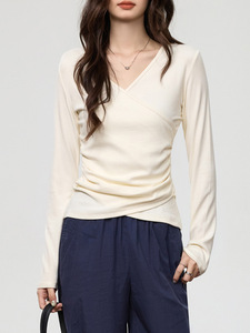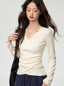 260g优可丝 高级设计感褶皱收腰洋气V领正肩长袖t恤女秋新款上衣