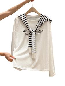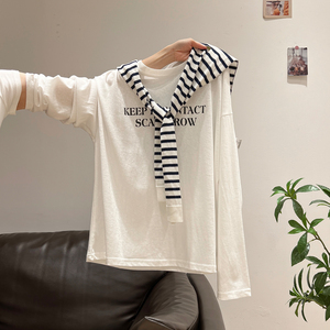 慵懒风1白色圆领字母印花长袖T恤女2025年早秋新款条纹披肩两件套