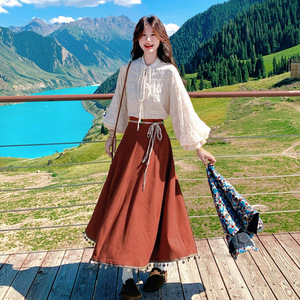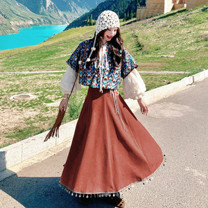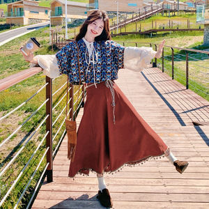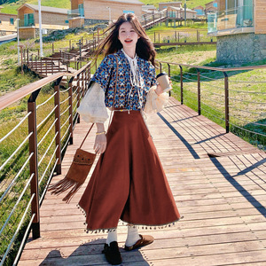 实拍复古度假风印花马甲套装2025秋时尚民族风衬衫流苏半裙三件套