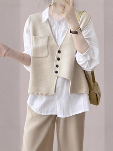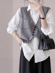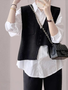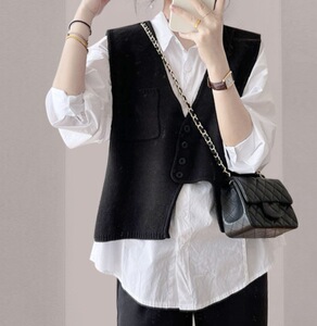 2025春秋不规则V领斜门襟叠穿背心马甲+上衣长袖翻领衬衫两件套装