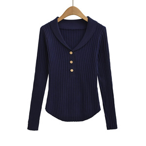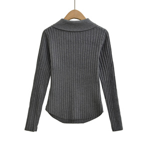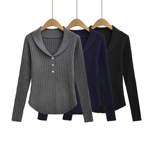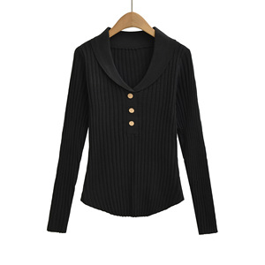 T324-25夏季新款 欧美风翻领单排扣螺纹坑条弹力长袖打底衫针织衫