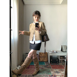 秋季穿搭一整套高级感小香风金扣外套条纹衬衫呢子短款半裙两件套