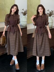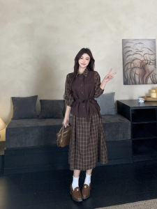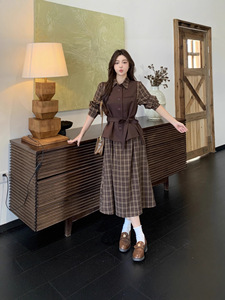 大码秋季新款洋气时尚格子连衣裙气质小香风马甲两件套时尚套装女