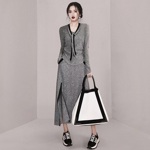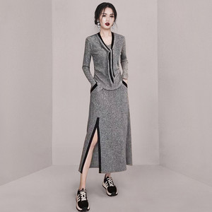 跨境2025秋冬新款 V 领系带收腰针织 + 高腰开叉半身裙气质两件套