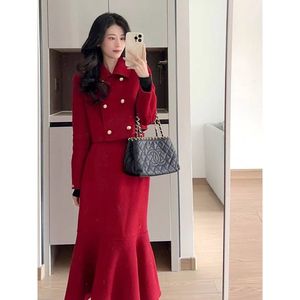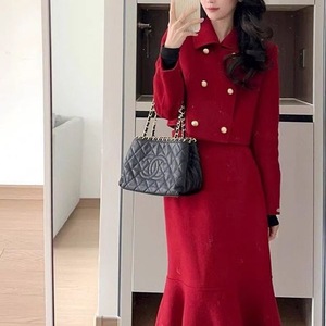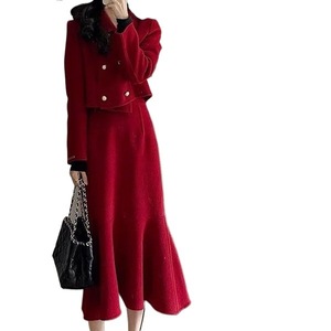 小香风套装裙名媛韩剧一整套洋气两件套红色连衣裙秋冬订婚礼服女