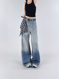 设计感渐变色直筒破洞牛仔裤女2025秋季新款高腰宽松显瘦阔腿裤子