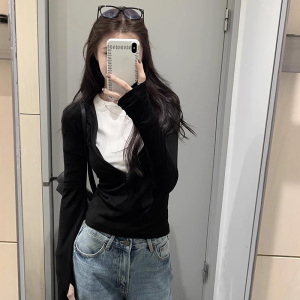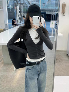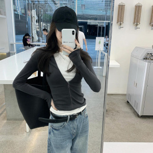 巨好看假两件上衣2025秋撞色辣妹长袖T恤女拉链款小众设计打底衫