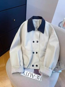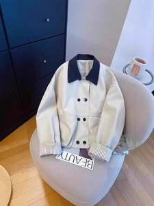 翻领撞色拼接双排扣风衣外套女2025秋装新款休闲宽松时尚夹克上衣