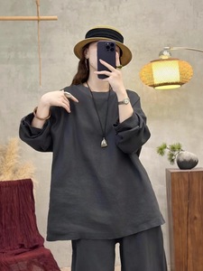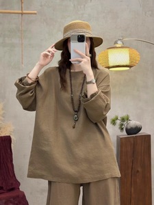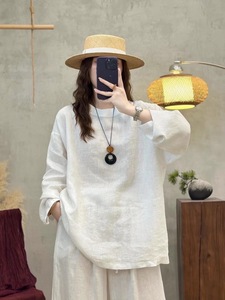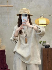 休闲气质亚麻简约风气质长袖小立领上衣夏季新款纯色文艺复古T恤