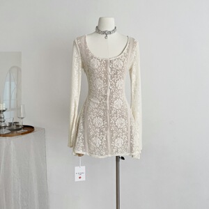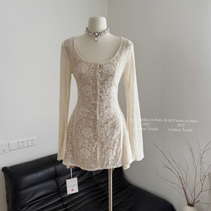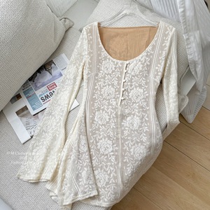 实拍YOLI张宥利迷失巴黎奶杏色镂空纯欲喇叭长袖连衣裙女修身收腰