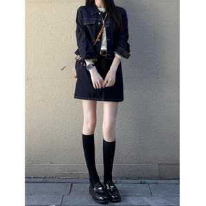 秋季复古时髦牛仔外套+原色水洗牛仔半身裙小个子防走光两件套潮