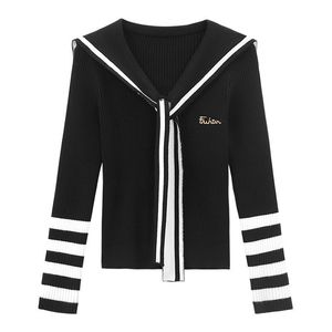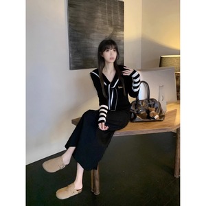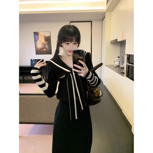 学院风海军领披肩长袖针织衫女秋季新款高腰显瘦半身长裙时尚套装