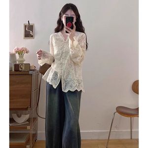 2025春季新款韩系复古别致阔腿牛仔裤百搭蕾丝衬衫气质马甲套装女
