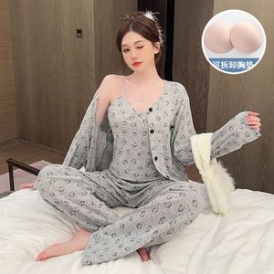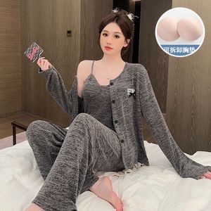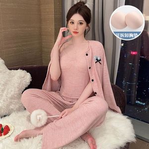 绵羊绒睡衣女秋冬季带胸垫韩版ins风开衫长袖三件套家居服可外穿