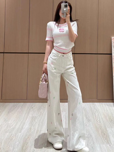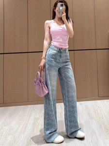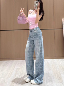 南油D家提花字母刺绣皮标牛仔裤女春秋新款宽松高腰直筒裤阔腿裤
