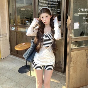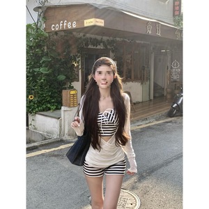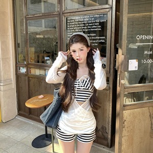 辣妹套装白色交叉罩衫T恤女内搭吊带背心夏季条纹休闲短裤三件套