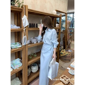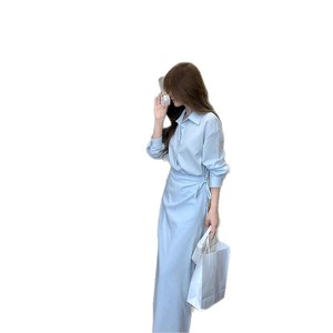 跨境感假两件蓝色衬衫连衣裙女早秋季小众设计显瘦气质POLO长