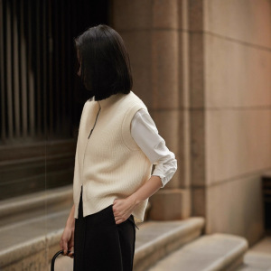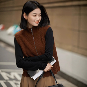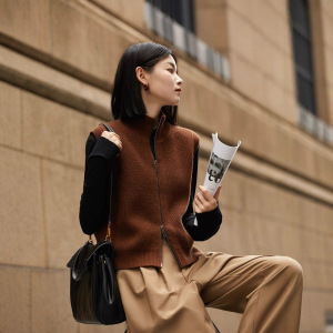 25秋新款羊毛混纺半高领针织马甲开衫拉链纯色无袖宽松坎肩女士