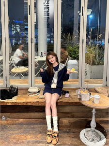 藏青色圆领卫衣短裙女20252新早秋薄款长袖上衣韩系半身裙学院风