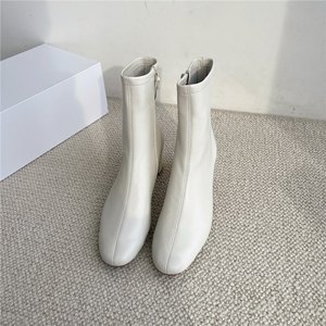 2025秋新款真皮复古粗跟小圆头侧拉链羊皮短筒靴舒适百搭瘦瘦靴女