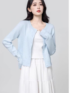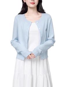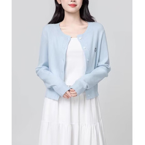 短款奶蓝色圆领针织开衫外套女2025春秋新款法式温柔长袖外搭上衣