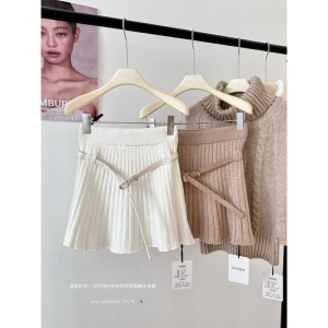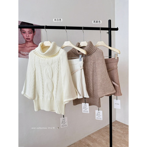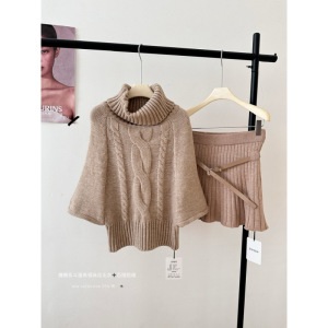 2025斗篷高领麻花外穿针织毛衣外套搭皮带百褶短款高腰半身裙套装