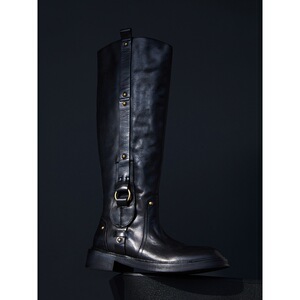 牛皮版~高筒气质金属扣不过膝骑士靴女黑色真皮粗跟侧拉链长筒靴