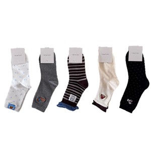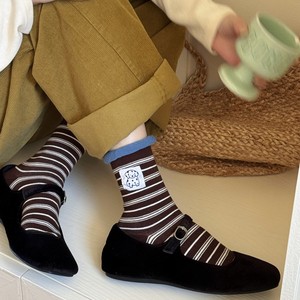 秋冬日系小点点刺绣布标小狗中筒袜撞色双罗口条纹复古袜子女纯棉